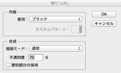 いよいよ、影を黒く塗ります。使用するのは「塗りつぶし」です。「編集>塗りつぶし…(Shift+F5)」で、「使用:ブラック」「描画モード:通常」「不透明度:70%」にして、「OK」を押します。